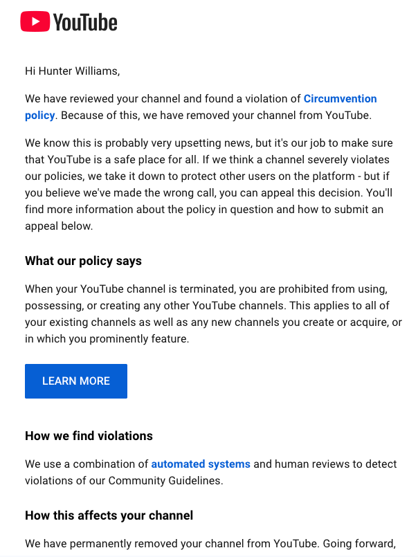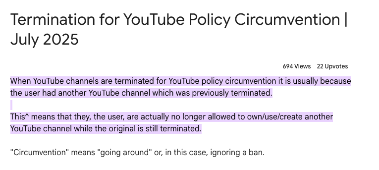 Apparently, I was “circumventing” their terms by making a new YouTube channel.