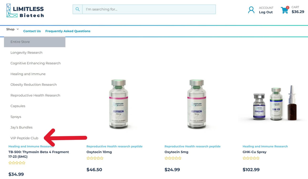 3) Once you are logged in, hover your mouse over the "Shop" tab and you will see a link to the VIP Peptide Club:
